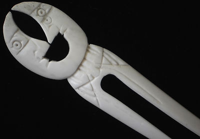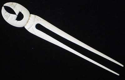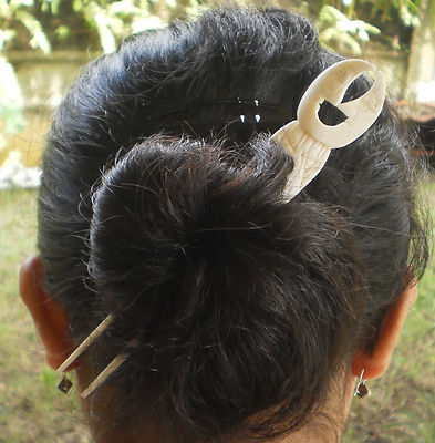 EXQUISITELY CARVED moon face hair fork carved with every detail and amazing feather pattern made in Bali by master carver from generations of bone carvers amazingly geometric for handcarved sustainable buffalo bone