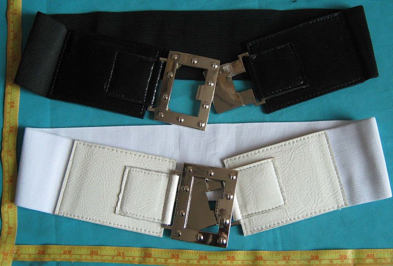 PVC BELT FRONT WITH ELASTIC BACK, ATS-8140 WOMEN'S CLOTHING ACCESSORIES BELT WIDTH 2.95", BLACK COLOR FITS 28" 1 SIZE ONLY, WHITE COLRO FITS 28.5" 1 SIZE ONLY WITH ELASTIC BACKING, PRICE PER UNIT PC BELT!! METAL BUCKLE, 2 COLOR CHOICES (BLK/WHT) PLS ADVISE THE COLOR NEEDED WHEN BUYING ALSO SELL BY WHOLESALE PAK EXPORTING QUANTITY IF HAVE ANY QUESTIONS PLS EMAIL US OR NEED ADDITIONAL INFO PLS CONTACT~ WE ARE MFG EXPORTERS FOR OVER 30YEARS AND WITH SELF OWED FACTORY MILL, ANY IMPORTING/WHOLESALING QUANTITY ARE WELCOME