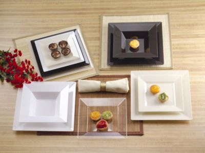 Being square never looked so good! Our versatile and modern Squares can be mixed and matched to create a fashionable table setting. Plates are specially designed with wide, deep edges to protect against food spillage and are oversized for optimum elegance. Bowls have carefully curved corners that add new dimension and style to any culinary selection. All are made from extra heavyweight plastic with a high gloss, polished finish.