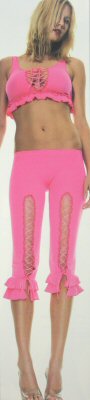 Sky - Lace Up Top with Laced Ruffled Capris - Lightweight - closeout Includes lace up front crop top with ruffle and Capri pants with lace up front and ruffle trim, 100% nylon, one size fits most.