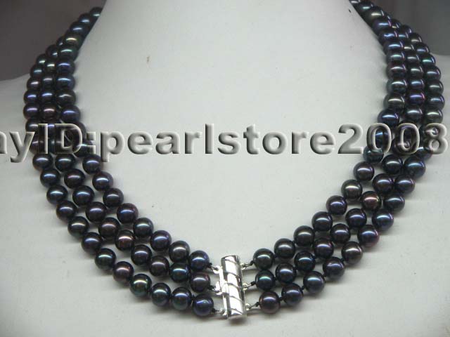 Stunning 3-row 6mm round black pearl necklace 925sc