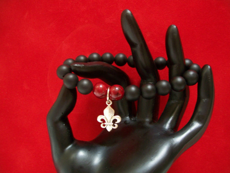 THIS BRACELET IS MADE FROM 10MM (just over 3/8") NATURAL MATTE ONYX STONE BEADS AND TWO RED DYED JADE BEADS WITH A 3D STERLING SILVER FLEUR DE LIS CHARM. FITS 7 TO 8 WRIST (STRETCHY). CAN BE MADE BIGGER OR SMALLER ~WHY PAY DESIGNER PRICES FOR THE EXACT LOOK AND QUALITY ~ WHEN YOU CAN PAY A FRACTION OF THE COST~