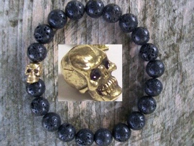 THIS BRACELET IS MADE FROM NATURAL 10MM (just over 3/8")LAVA ROCK AND FEATURES A LARGE VERY DETAILED SILVER PEWTER SKULL. FITS 7 1/2 TO 9 WRIST (STRETCHY). CAN BE MADE BIGGER OR SMALLER. WHY PAY DESIGNER PRICES FOR THE EXACT LOOK AND QUALITY ~ WHEN YOU CAN PAY A FRACTION OF THE COST.