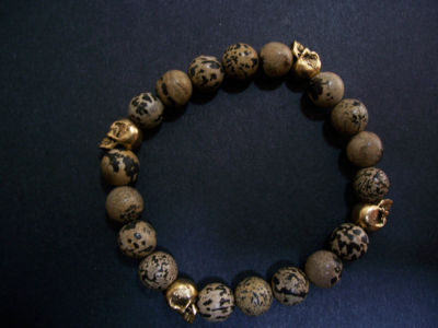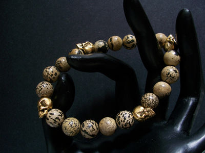 This natural stone bracelet is made from large Leopard Jasper beads and is accented with 4 very detailed Pewter skulls. These stones have a very exotic look and are high quality. Bracelet will fit up to an 8 inch wrist comfortably. Sizing is free so if you need bigger or smaller let us know.
