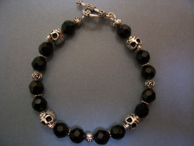 THIS BRACELET IS MADE FROM 10MM (just over 3/8") FACETED BLACK ONYX BEADS AND 4 SILVER PLATED SKULLS. SKULLS ARE VERY DETAILED WITH ROSES SCROLLED INTO THE CROWN. PIECE IS ACCENTED WITH PEWTER ROSES AND SILVER PLATED SPACER BEADS. MADE FROM HIGH QUALITY MATERIALS AND IS BUILT TO LAST. WHY PAY DESIGNER PRICES FOR THE EXACT LOOK AND QUALITY ~ WHEN YOU CAN PAY A FRACTION OF THE COST. FITS 7 1/2 TO 8 1/2 WRIST. CAN BE MADE BIGGER OR SMALLER. CUSTOM MADE.