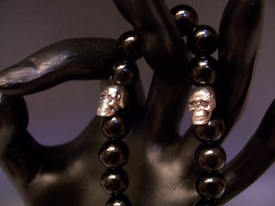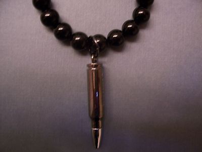 Bracelet is made with natural 10mm (5/16") black onyx stones. It features a bullet pendant and 2 high detail pewter skulls. Extremely unique and a definate eye catcher! This bracelet is made from high quality materials. Comfortably fits 7 1/2 to 8 1/4 inch wrist. If you need it bigger or smaller, sizing is free ~ Why pay designer prices for the same look and quality, when you can pay a fraction of the cost.