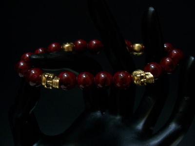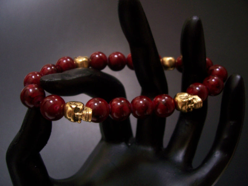 THIS BRACELET IS MADE WITH LARGE RED DYED JADE STONES AND HAS FOUR VERY DETAILED AND HIGH QUALITY GOLD OR SILVER PEWTER SKULLS (PICTURED IN GOLD).THE BEADS ARE A DARK BLOOD RED COLOR AND HAVE FAINT BLACK MARBLING. VERY UNIQUE AND STRIKING. COMFORTABLY FITS 7 1/2 TO 8 1/2 WRIST (STRETCHY).CAN BE MADE BIGGER OR SMALLER. WHY PAY DESIGNER PRICES FOR THE EXACT LOOK AND QUALITY ~ WHEN YOU CAN PAY A FRACTION OF THE COST.