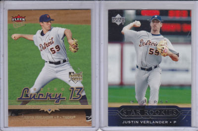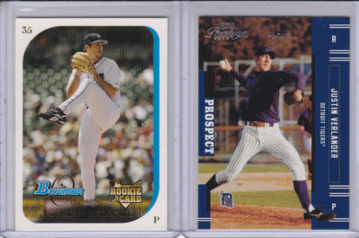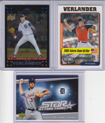 Thanks for viewing Leslies auction and welcome to my new store, Northcountry Cardboard collectables. Up for bid is a spectacular 24 Rookie card lot of all different and all official First year, Prospect and Rookie cards of Justin Verlander. This has been a special year for Justin, making it a special year for the Tigers. Another no hitter and 3 other games pitched, into the 7th and 8th innings, with no hitters? simply amazing!! in fact, justins very next start, after his 2nd career no hitter, he took a No Hitter into the 8th inning. Im not 100% positive, but fairly certain that nobody in Baseball history has pitched back to back No Hitters and to come 3 or 4 outs of doing that is simply an amazing accomplishment. Verlander has solidified his status in baseball this year and has made a step up the ladder as one of those Elite players. We know their names as Jeter, Pujols, CC, Oswalt, Halliday. This kid still has 15 OR MORE YEARS!!!!! Barring any injury. Is a pitcher with 6 years under their belt, concidered in their prime? or is he just finding his nitche? Maybe both. Is Verlander capable of a No Hitter every 3 to 4 seasons? I think so, after watching him this year. Nolan Ryan has 6 and look at his RC. Its in the clouds!!!! Compare the strikeouts, compare the win/loss records of each, at each level/year. Concider the weak and strong teams, both have had to deal with. The conditional Book Value of these 24 cards is around $500, right now. They are on the rise, as we speak and this is before the playoffs and the Cy Young and MVP announcements. 400 wins? 6000 strikeouts? Out of the question? Maybe? is it possible? Definitly!!! He's got the ROY in his accomplishments. I honestly feel we can count on the Cy Young this year. MVP could be a different story, but not out of the question ALA Dennis Eckersley 1992. Where will these cards be in 2035, after verlanders Retirement and enshrinement into the hall? only time will tell. ill be 72 and my guess is the chances of these cards being worth a mint, are far better than the chances of me being around to see it. Best of luck and God Bless!!