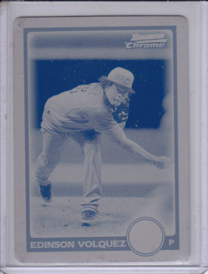 Up for bid, from the 2010 Bowman Chrome Hobby set, i bring you a very nice, Pack/case fresh, 1/1 Printing Plate of Cincinnati Reds Hurler, Edinson volquez. This Plate is in nice condition, with pretty good corners and edges. This plate is the Cyan Color Of volquezs 2010 Bowman Base card. Would make a great addition to any Volquez, Reds or Plate collectors collection. Best of luck bidding and God Bless!!!
