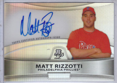 Up Next for bid, from the 2010 Bowman Platinum Prospect set, i bring you a super sharp Auto/Refractor of Philadelphia Phillies future star 1B man and 6'5 monster, Matt Rizzotti. 2010 stats in AA were a fabulous 363/16/62. now in AAA, He's 1 step from the parent club. Look for great things in the future for this guy who compares to Jason Giambi, per prospecters. I will list this card as a BIN item. I only say this about a few players each year, but grab anything and everything you can, with his name on it. He could make the opening day Roster in 2012 and could easily be a 1st year 20 Homer guy. He's got that kind of power and He's been slowly brought along, being a #6 selection in the 2007 draft. Best of luck and God Bless!!