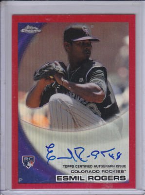 Good Evening and welcome To Northcountry Cardboard Collectables and Leslies auction. Up for bid, Im pleased to offer, from the 2010 Topps Chrome Hobby Collection, this sharp Red Refractor Auto of Colorado Rockies, converted Pitcher, Esmil Rogers. He's young, but is making steady strides to be more dominant. He does have good mechanics, just lacking experiance. For the price im listing this at, its definatly worth the gamble, as many dominant pitchers have started careers the same way. I will list this as a BIN item at a low price, in my opinion and will gladly concider all reasonable offers. I wish you all the best and also would like to thank you for taking the time out to view my items and my store. Keep in mind that i have 25,000 + Autos, GUed, RC, Graded, Vintage, oddball and just about anything and everything you can imagine, so im sure you can understand the time and dedication it takes, to simply list items, especially with the overall size of my collection. Anything and everything is and will be available, at some juncture. If their are items you are specifically looking for, or players/teams you collect, send me a message and i will make bulk deals that will be rock bottom priced. Thanks, Happy Holidays and God Bless!!