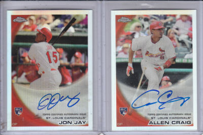 Hello and welcome To Northcountry Cardboard Collectables and Leslies auction. From the 2010 Topps Chrome Hobby collection, I bring you a SHARP, Refractor Rookie Auto of St Louis Cardinals Outfielder and Speedy Leadoff hitter, Jon Jay. Card is SNed 149/499 and is in NrMt to Mt condition. This card will be listed as a BIN item, at a low price for you to grab it fast. I will also concider all reasonable offers for this item. Best of luck and God Bless!!