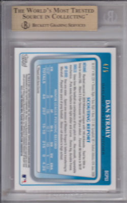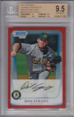 Good Evening and welcome To Northcountry Cardboard Collectables and Leslies auction. Up for bid, Im pleased to offer, from the 2011 Bowman Prospects Hobby Collection, This Beautiful Red Refractor, SNed 4/5 and BGS Graded Gem Mint 9.5 of Oakland A's pitching prospect, Dan Straily. I will list this as a BIN item at a low price, in my opinion and will gladly concider all reasonable offers. I wish you all the best and also would like to thank you for taking the time out to view my items and my store. Keep in mind that i have 25,000 + Autos, GUed, RC, Graded, Vintage, oddball and just about anything and everything you can imagine, so im sure you can understand the time and dedication it takes, to simply list items, especially with the overall size of my collection. Anything and everything is and will be available, at some juncture. If their are items you are specifically looking for, or players/teams you collect, send me a message and i will make bulk deals that will be rock bottom priced. Thanks, Happy Holidays and God Bless!!