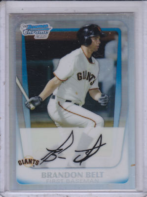 Good Morning and welcome To Northcountry Cardboard Collectables and Leslies auction. Up for bid, From the 2011 Bowman Chrome Prospects Hobby Collection, im happy to offer you this Sharp Prospect Refractor of San Francisco Giants Hard Slugging, First Baseman, Brandon Belt. SNed 638/799 and # BCP93 in the set. This card will be listed at auction, starting at only .99 cents, with no Reserve and no BIN. I wish you all the best and also would like to thank you for taking the time out to view my items and my store. Keep in mind that i have 25,000 + Autos, GUed, RC, Graded, Vintage, oddball and just about anything and everything you can imagine, so im sure you can understand the time and dedication it takes, to simply list items, especially with the overall size of my collection. Anything and everything is and will be available, at some juncture. If their are items you are specifically looking for, or players/teams you collect, send me a message and i will make bulk deals that will be rock bottom priced. Thanks and God Bless!!