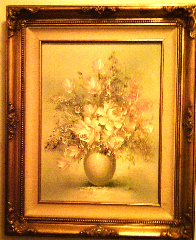Floral painting in pale greens and pinks framed