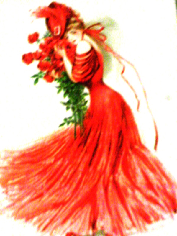 Vintage litho 1907 show girl Gray Co. New York red dress
