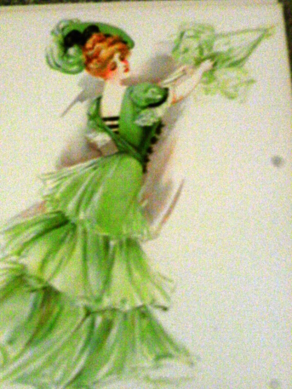 Vintage litho 1907 showgirl Gray Co. New York green dress