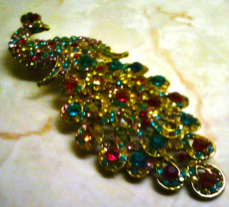 Pre-owned brooch multi -color peacock approximately 4" long cubic zirconia stones