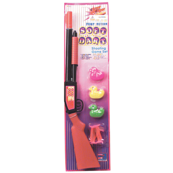 It's like shooting ducks on a pond. This pump action rifle shoots soft darts with suction cups on the ends. Each set includes one rifle five soft darts and three duck targets in blister card packaging.