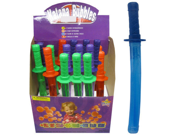 Clear plastic sword with bubble solution and a 7"" bubble wand within. The 15"" sword makes for an excellent accessory to a costume or for outdoor dueling in addition to making very large bubbles. The sword color assortment is blue, green, purple, and red. A shelf display holds a 24 piece assortment. Each has a UPC code label." Case Pack 48 Please note: If there is a color/size/type option, the option closest to the image will be shipped (Or you may receive a random color/size/type).