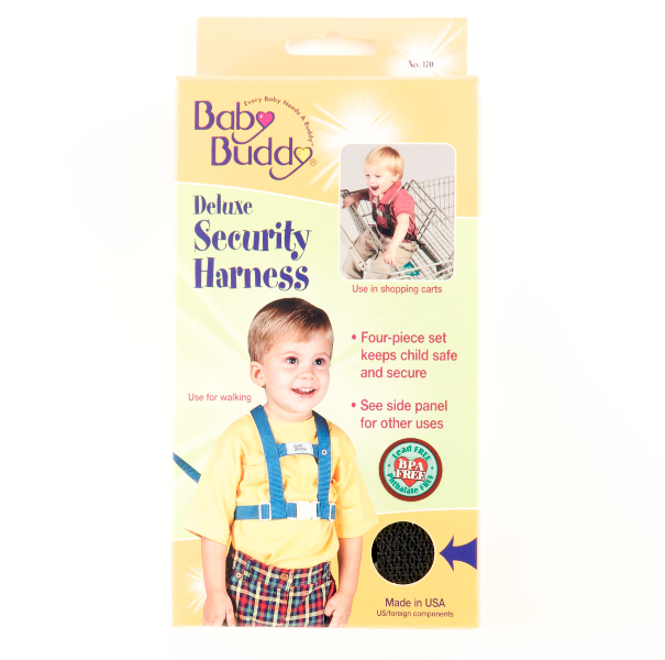 Deluxe Security Harness is multi-purpose harness keeps children nearby while walking in crowded public places and secure while seated in a shopping cart stroller or high chair. 4pc set includes adjustable harness (6mos-4yrs) chair restraint straps and tether strap.