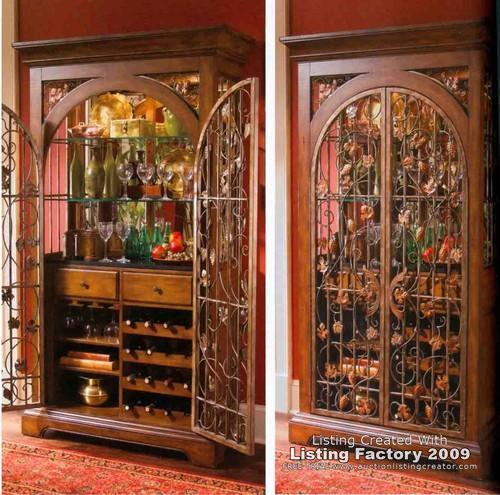 The Cordova Finish Wine Cabinet features a cordova finish, touch lighting, wrought iron doors, two drawers, mirrored back, wine bottle storage, and adjustable glass shelves.
