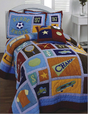 This colorful score patchwork quilt will teach your child about sports, while they snug in this 100% soft cotton hand made quilt. This is a beautiful quilt that includes two stadard sham and a 16x16.