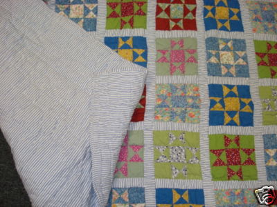This is a beautiful traditional Carolina throw with patterns that takes inspiration from the gently turning blades of windmills. We re-created its old-fashioned charm by using vintage fabric prints framed in borders of yarndyed striped chambray.