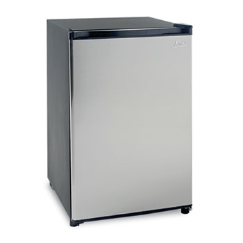 Sleek stainless steel design with 4.5 cubic feet capacity. Includes full-range thermostat, reversible door and full-width chiller compartment. Gravity feed can storage in door, holds up to five 12 oz. cans. Also features manual defrost option, slide-out shelves and door rack. Capacity (Volume): 4.500 cu. ft.; Width: 20 1/4 in; Depth: 21 1/2 in; Height: 32 1/4 in.