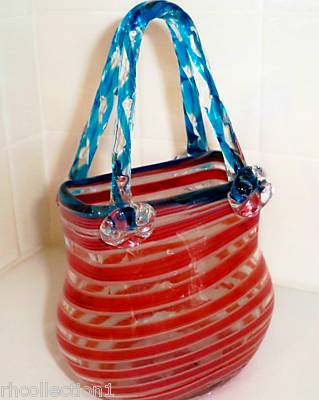 You are bidding on a wonderful red, white, blue and clear hand blown art glass basket - IN EXCELLENT CONDITION, pre-owned.