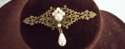 Vintage Gold Tone Metal Pearl Center & Drop Pin Brooch