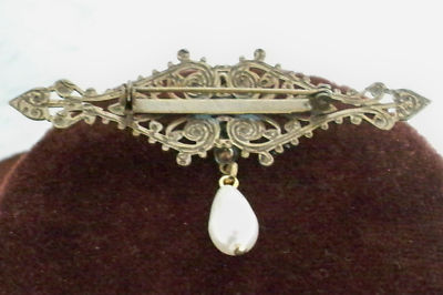 This lovely vintage brooch measures approximately 2.75" long x 1.5" at centerpoint pearl drop.
