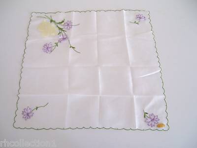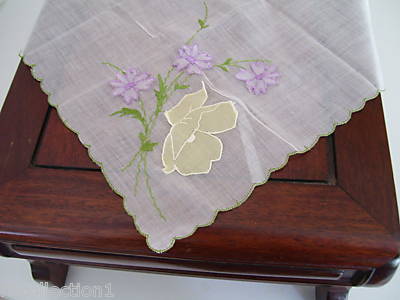 You are bidding on a gorgeous vintage (with label attached/never used) 100% cotton handkerchief with embroidered 3 dimensional yellow butterfly and orchid flowers, made in Switzerland - IN NEW CONDITION.