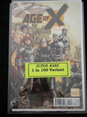 YOU ARE BIDDING ON A BRAND NEW COMIC FROM MARVEL, THIS IS THE AGE OF X ALPHA #1 RARE 1 IN 100 VARIANT COVER, THIS COPY IS IN MINT CONDITION AND HAS BEEN IN A TOP LOADER W A BOARD. THIS IS MARVEL COMCIS AT ITS BEST THIS IS RATED T+. ALL MY COMICS ARE BRAND NEW AND COME BAGGED AND BOARDED UNLESS NOTED OTHERWISE. I SELL AND BUY FOR ONE OF NRE ENGLANDS LARGEST COMIC AND COLLECTIBLE CHAINS. IF I DONT HAVE IT ASK ME I CAN PROBABLY GET IT. THANK YOU