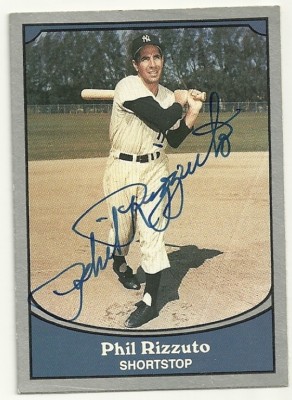 Up for auction is one 1990 Pacific card #101 that has been signed by deceased Baseball Hall of Fame great Phil Rizzuto signed in blue sharpie. Phil Rizzuto played in the Major Leagues from 1941-1942 & 1946-1956 for the New York Yankees. Following his playing career Rizzuto became the Yankees TV & radio broadcaster from 1957-1996. Mr Rizzuto passed away in 2007. FREE SHIPPING when you use Buy-It-Now! If you use the Buy-It-Now please wait for me to send you an invoice before paying! Your item will be put in a top loader and shipped in a bubble envelope via USPS first class parcel w/delivery confirmation for your protection. If you want your item insured(recommended)email me at end of auction to add it to your invoice! I have been an autograph collector for many years and I quarantee the authenticity of all my items that they would pass PSA/DNA certification. Please check out my other auctions of signed HOF items as well as other great signed & unsigned memorabilia. Thanks for looking!