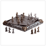 Knights and dragons square-off on a medieval board that adds mystical appeal to the timeless battle of chess. All 32 finely detailed chessmen fit inside the elaborately carved chessboard case. Alabastrite and wood. 17" x 17" X 2 3/4" high.