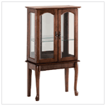 Wood curio cabinet with glass doors, glass shelf and a mirrored back. Some assembly required. Birch veneer; alder legs (Cabinet contents not included). 22" x 11" x 39 1/4" high.