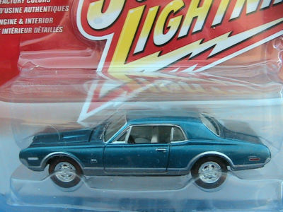 1/64 scale,1968 Mercury Cougar GT-E,metalic blue with white interior,redline tires,opening hood, MOMC...JL window cling