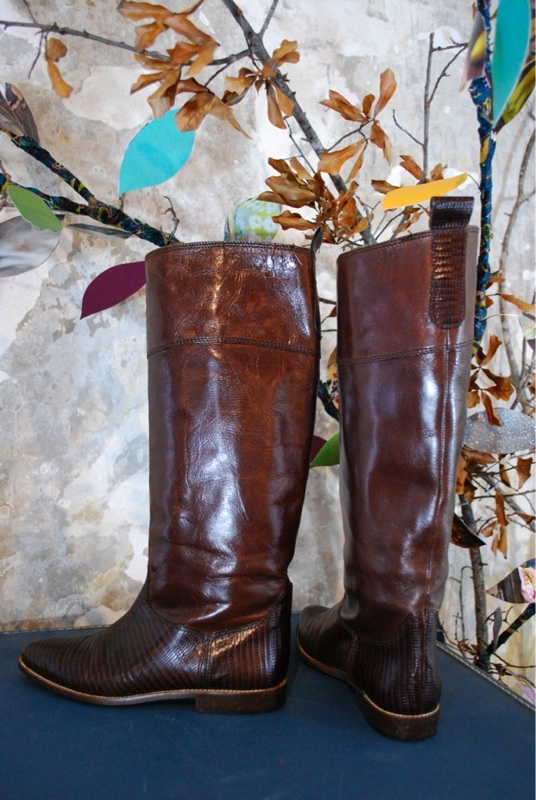 Item Descriptionn Style.... Boho, Indie, New Wave Cut.... Riding Boot Material.... Leather Label.... Liz Claiborn, Made in Italy Color.... Dark Brown Pattern.... Alligator stamped leather around base of foot, and at back top of shaft Buckle/Tie.... No Zips.... No Condition.... EXCELLENT~ Previously worn, with only very slight wear; no flaws Size.... 7.5 (see measurements) Misc.... Well made beauties; hardly worn