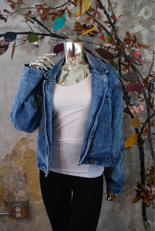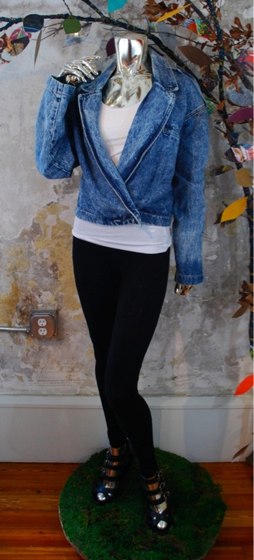 Item Descriptionn Style.... Punk, Urban, Hip Cut.... Cropped Material.... Jean, Denim Label.... Driver Color.... Blue Acid Stone Wash Pattern.... None Bodice.... Pocket left bust, Wrap coat that buttons at waist, Panels in back, darts in front, button tabs at shoulder Neckline.... Deep V, Pointed Collar Sleeves.... Long Waist.... Fitted, Buttons at front side Skirt.... N/A Pant.... N/A Length.... Waist Buttons.... Gold tone Zips.... No Lined.... No Condition.... EXCELLENT~ Previously worn, with only very slight wash wear; no flaws Size.... M (see measurements) Misc....