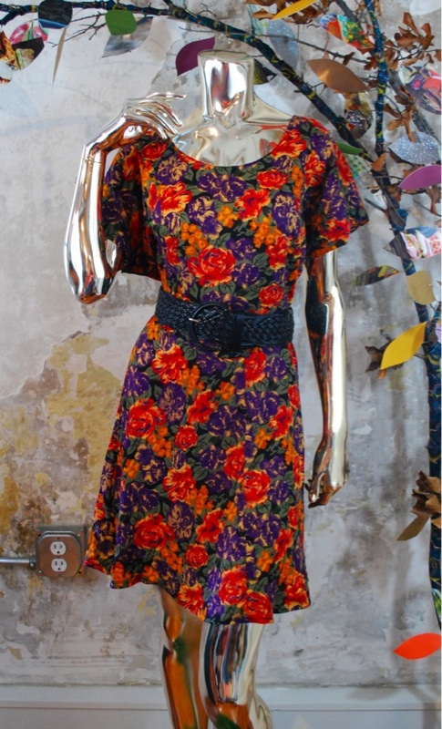 Style.... Hipster, Boho Cut.... Hour Glass Material.... Cotton Label.... Jamie Brooke Color.... Fall colors Pattern.... Floral Bodice.... Neckline.... Scoop Sleeves.... Short Waist.... V in front, Cinch in back Skirt.... Full Pant.... N/A Length.... Above knee Buttons.... None Zips.... In back Lined.... No Condition.... EXCELLENT~ Previously worn, with only very slight wash wear; no flaws Size.... No size tag (see measurements) Misc....