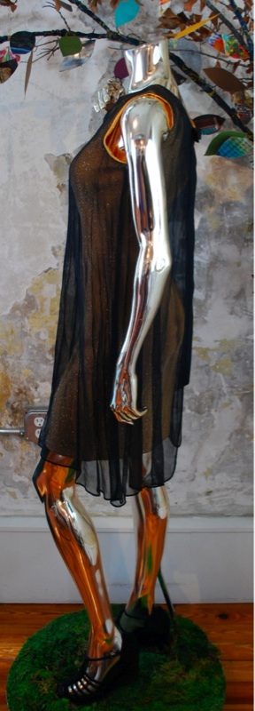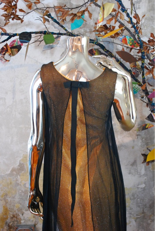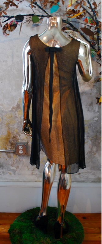 Item Descriptionn Style.... Cocktail, Evening, Classy Cut.... Hourglass Material.... Unknown Label.... None Color.... Gold and Black Pattern.... Shimmery shiny gold material Bodice.... N/A Neckline.... Scoop with black bow that cascades down the back Sleeves.... None Waist.... Darts front and back to give it a skin-tight fit Skirt.... The gold shell is form-fitting with a loose sheer black overlay Pant.... N/A Length.... Knee-length Buttons.... No Zips.... Up back Lined.... No Condition.... EXCELLENT~ Previously worn, with only very slight wash wear; no flaws Size.... No size tag (see measurements) Misc....