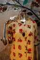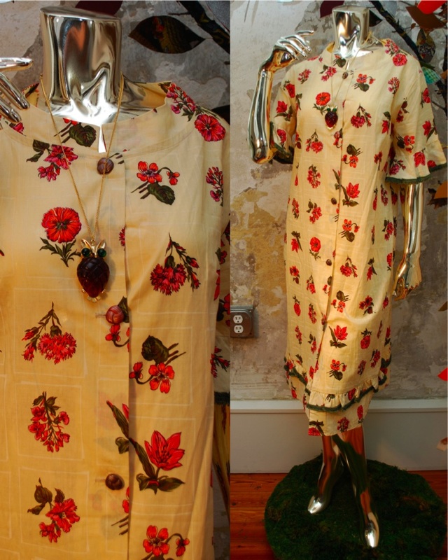 Buttons.... Green & dusty rose plastic patterned buttons cascade down the front of entire dress