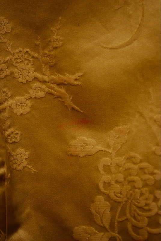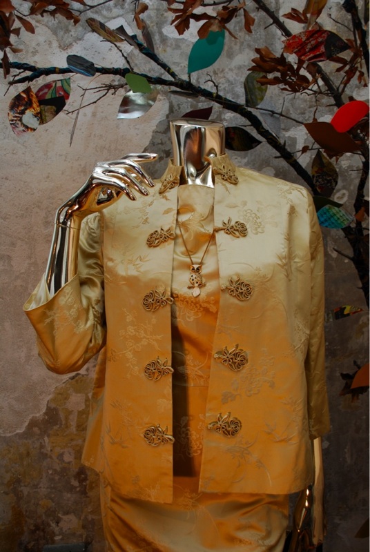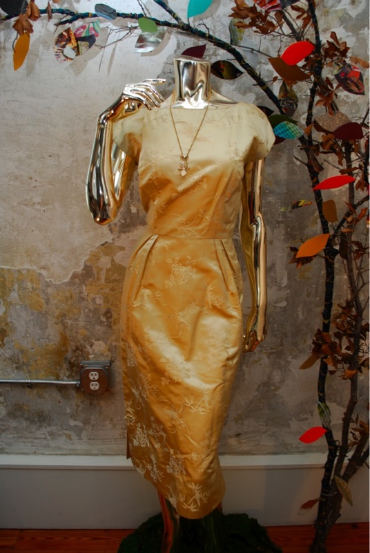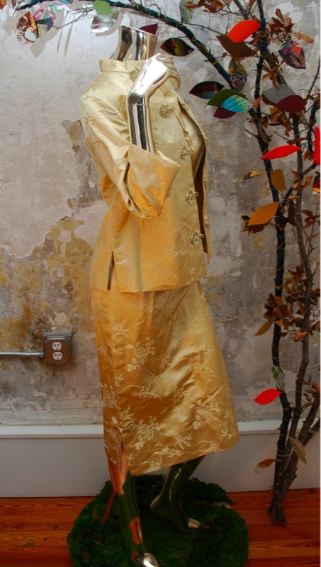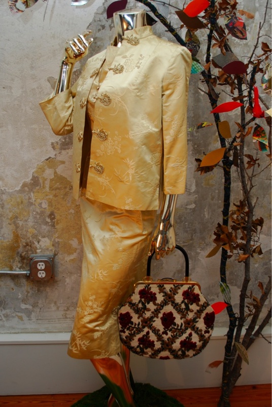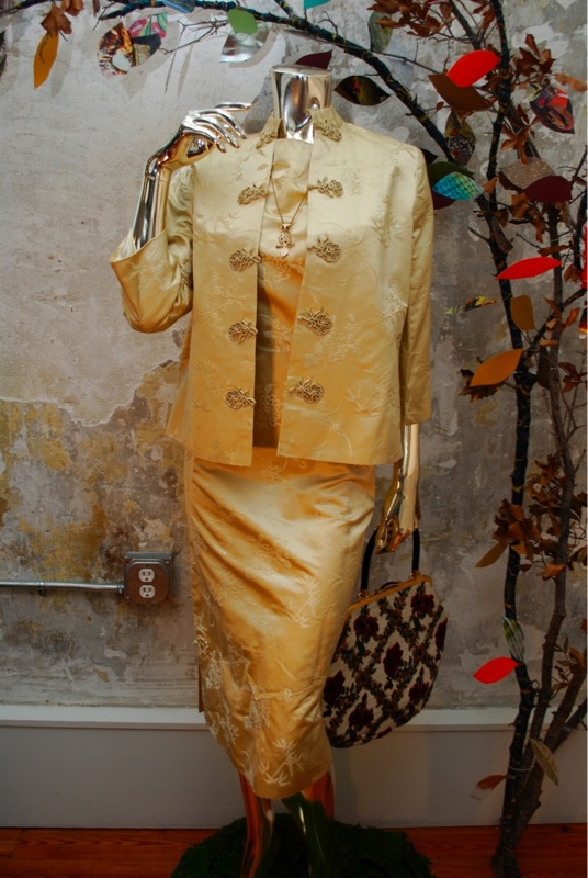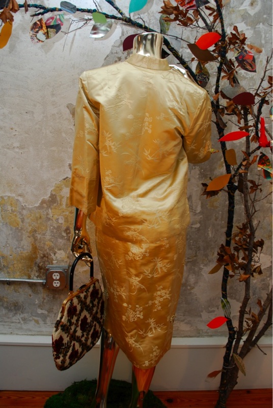 IItem Descriptionn Style.... Elegant, Evening, Asian Cut.... Hour glass dress, Asian jacket Material.... Soft satin Label.... None Color.... Gold Pattern.... Asian floral print in gold Bodice.... Darts on bodice at front and back Neck line.... Boat neck on dress, Jacket has mandarin collar Sleeves.... Cap sleeves on dress, Three quarter sleeve on jacket Waist.... Dress has pleats at waist Skirt.... 6" side slits on both bottom sides of skirt toped off with Asian rosettes Pant.... N/A Length.... Knee length dress, Jacket hits at hip Buttons.... Jacket buttons up the front with Asian rosettes Zips.... Dress zips up the side Lined.... Jacket fully lined, Dress no Condition.... GOOD/PLAY~ Previously worn with minor visible flaw (Faint very light reddish mark on bust and skirt....see photo, also looks like someone spot cleaned the front of the jacket at one point) but the grooviness of the piece makes for a desirable item and it still has lots of wear left Size.... No size tag (see measurements) Misc.... Pinned on model