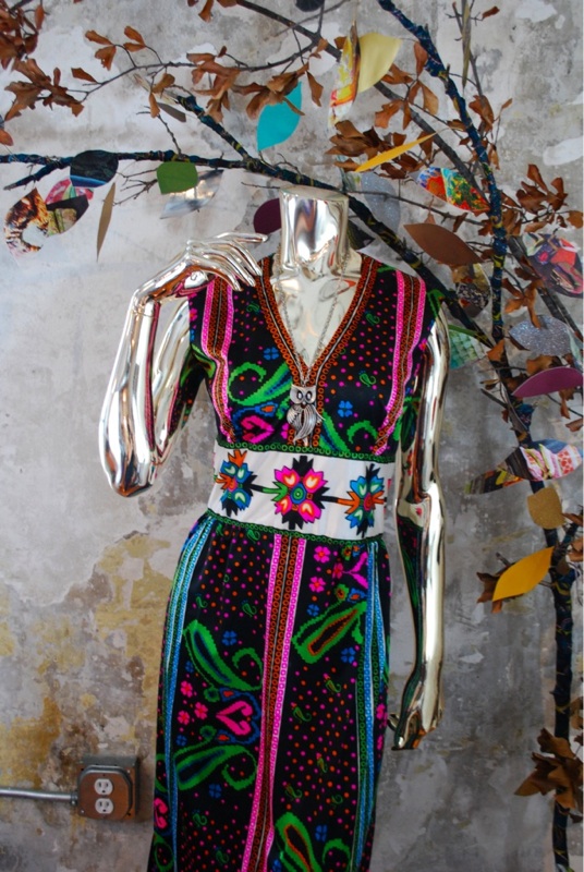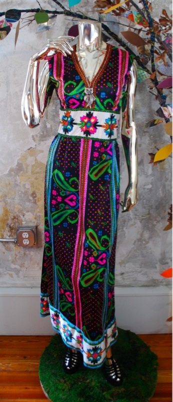 Item Descriptionn Style.... Glamorous maxi at its best, MOD Cut.... Empire, Maxi Material.... Poly Label.... None Color.... Black; Hot pink; Bright green; Orange; White; Blue Pattern.... Psychedelic Paisley Bodice.... Darts in the front Neckline.... V-Neck Sleeves.... None Waist.... Empire with contrasting pattern on white Skirt.... Straight Pant.... N/A Length.... Ankle Buttons.... None Zips.... Up the back Lined.... No Condition.... EXCELLENT~ Previously worn, with only very slight wash wear; no flaws Size.... No size tag (see measurements) Misc.... Pair this with a dry martini for a FABulous night out on the town