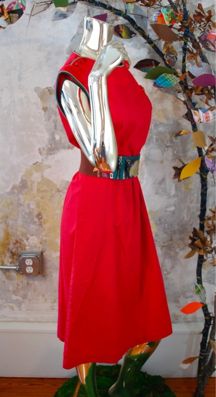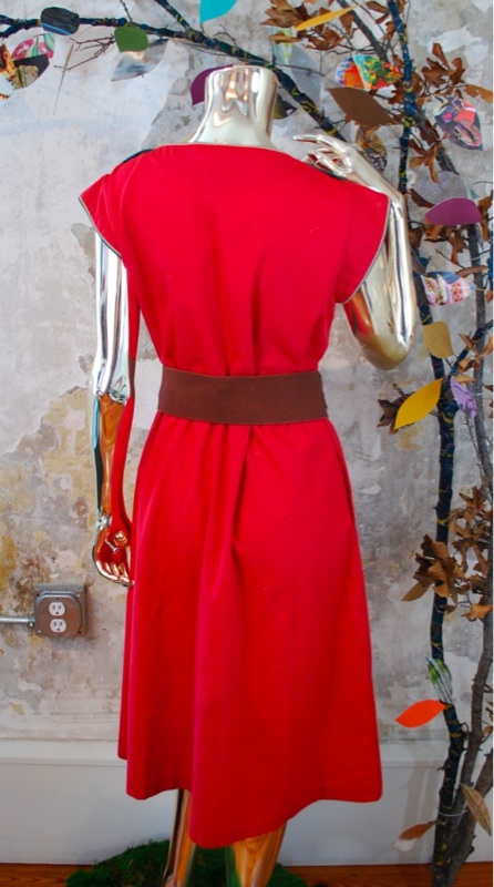 Item Descriptionn Style.... EMO; Hipster; Boho Cut.... A-Line Material.... Cotton Label.... Cut Ups Color.... Blood Red; Tan; Forest Green Pattern.... None Bodice.... Small front pocket with piping Neckline.... Boat-neck, with piping detail over the shoulders; 3 buttons on each shoulder Sleeves.... Cap Waist.... Gathered Skirt.... A-Line with 2 side pockets Pant.... N/A Length.... Knee Buttons.... Red Plastic Zips.... No Lined.... No Condition.... EXCELLENT~ Previously worn, with only very slight wash wear; no flaws Size.... No size tag (see measurements) Misc.... Not pinned on model