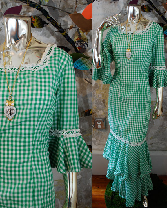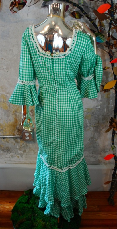 Neck line.... Square with green velvet ribbon and white lace trim