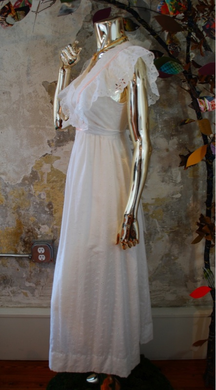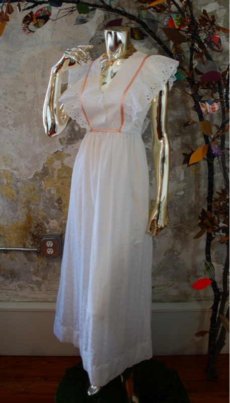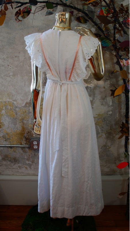 Item Descriptionn Style.... Prairie, BoHo, Hippie Cut.... Maxi, Empire Material.... Cotton Label.... Vicky Vaughn Junior Color.... White with Peach ribbon Pattern.... White eyelet and embroidery Bodice.... Form fitting, with ruffle and ribbon detail Neckline.... Beautiful scalloped eyelet in a 'V' shape Sleeves.... None Waist.... Empire with attached belt that ties in back Skirt.... Long, free, open, full Pant.... N/A Length.... Calf Buttons.... None Zips.... Up the Back Lined.... Fully Condition.... MINT~ Appears new: No signs of wear; washed and possibly worn; no flaws Size.... No size tag (see measurements) Misc.... Not pinned on model