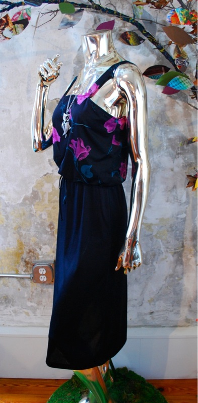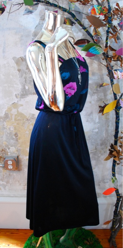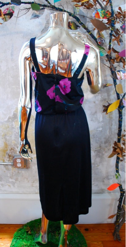 Vtg 70s Black FLORAL Summer Secretary DAY DRESS XS S