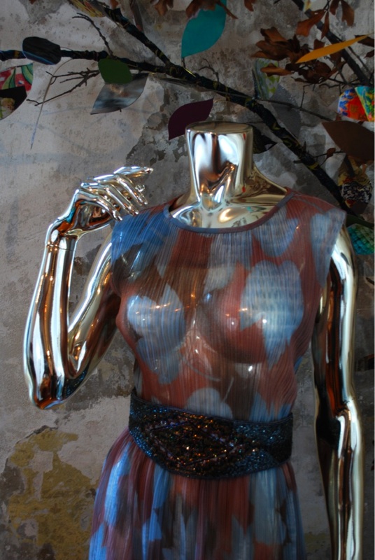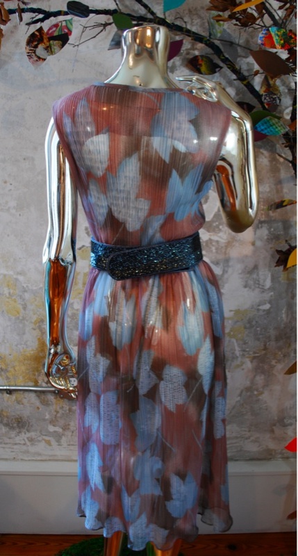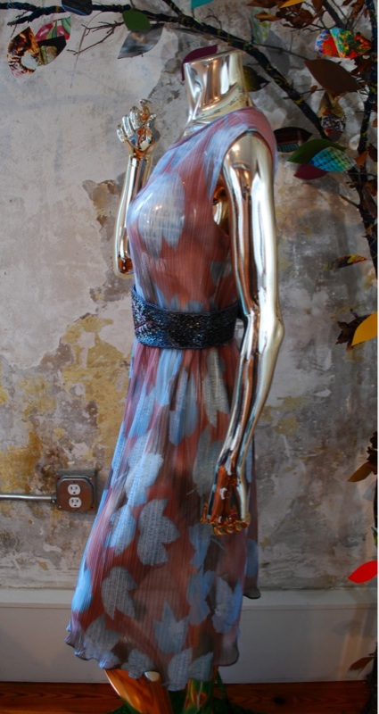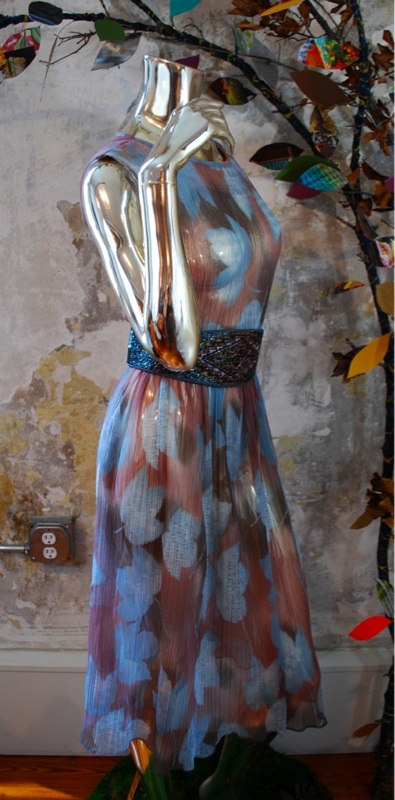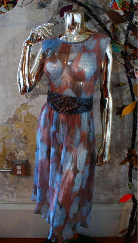 Vtg 70s Brown Blue PLEATED Sheer Cocktail DRESS S